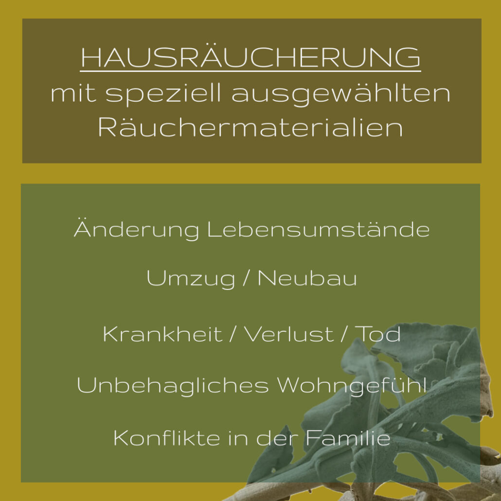 Bei der energetischen Hausreinigung stelle ich durch die RÄUCHERUNG aller Wohnräume (auch Keller, Garage, Nebengebäude) mit weißem Salbei und ausgewählten energetischen Räuchermischungen die RUHE und LEBENSQUALITÄT im Heim wieder her.